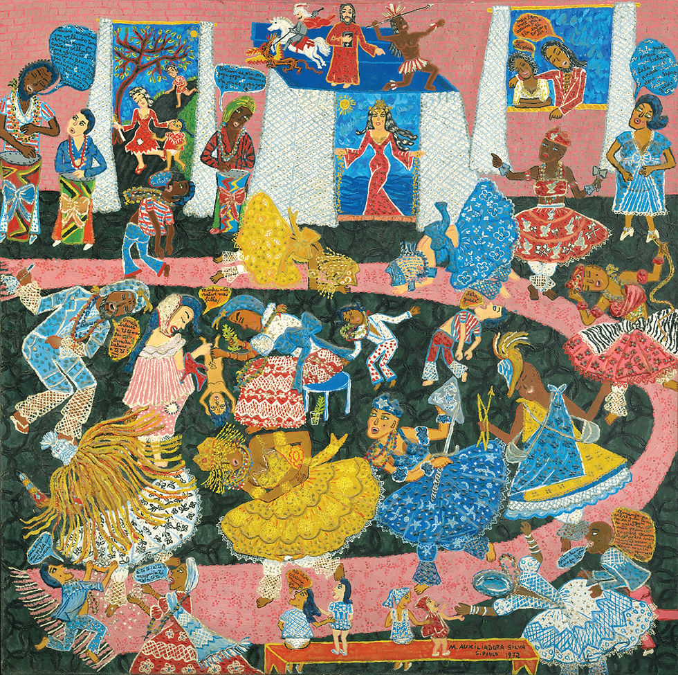 Cores vibrantes. Representação da vida popular e do povo afro-brasileiro. Estes pontos descrevem as obras de Maria Auxiliadora da Silva, pintora brasileira autodidata, que expunha sua voz por meio da arte, ao retratar a vida doméstica e rural, religiões afro-brasileiras, festas (como o carnaval) e outros temas que estão presentes tradicionalmente na cultura de nosso país, em quadros coloridos de pintura a óleo com elementos de colagem. O seu talento era indizível e seu legado merecia estar no mesmo patamar.